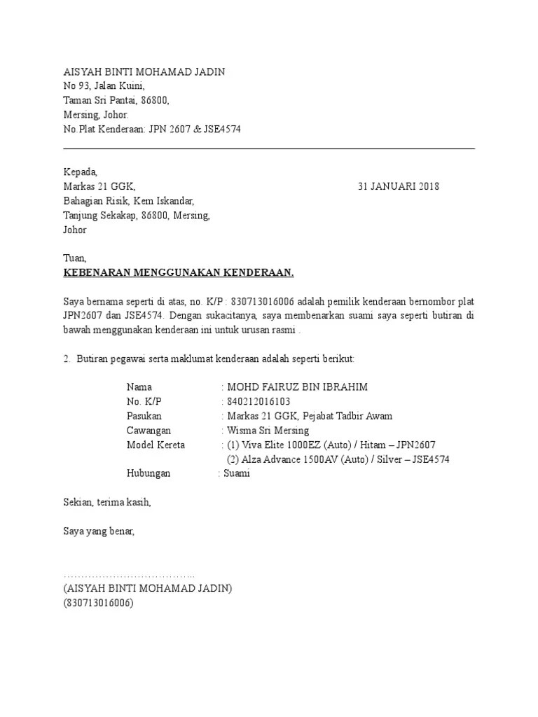 Untuk makluman pihak tuan, nombor pendaftaran kenderaan tersebut. Tuan, kebenaran menggunakan kenderaan saya seperti nama di atas, dengan ini memberi kebenaran kepada rakan sejawat saya dari smk …………, nama (no ic) untuk . Contoh surat memohon kebenaran menggunakan kendaraan have a graphic from the othercontoh surat memohon .